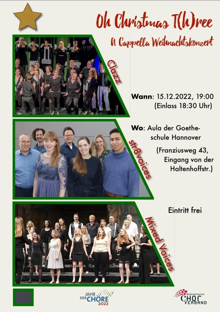 Wir singen zusammen mit Gretchens Antwort(Berlin) und The Swingles (London) beim großen Abschlusskonzert im Theater am Aegi. Das Konzert ist schon ausverkauft! Schaut unbedingt eins der anderen tollen Konzerte an! Klickt hier!